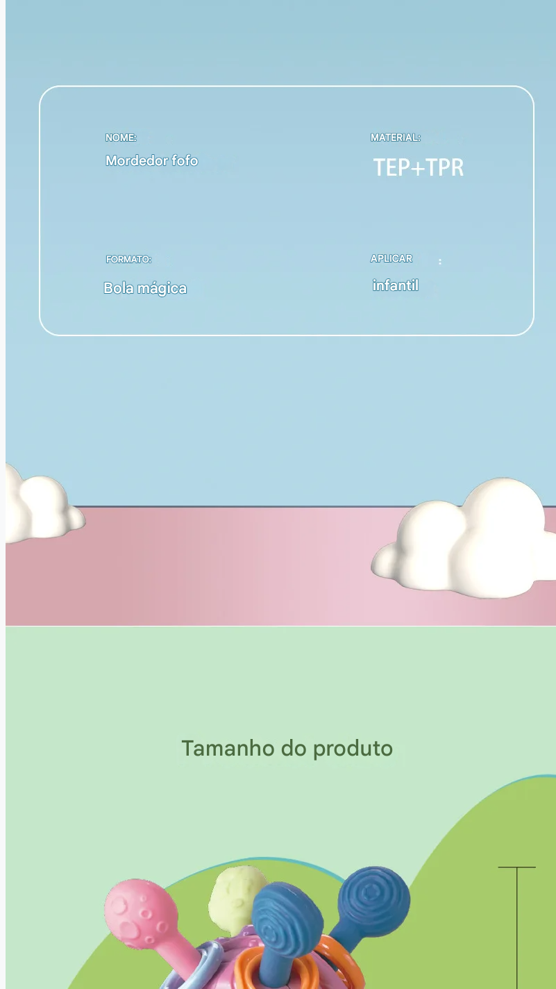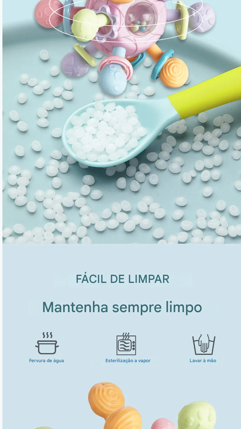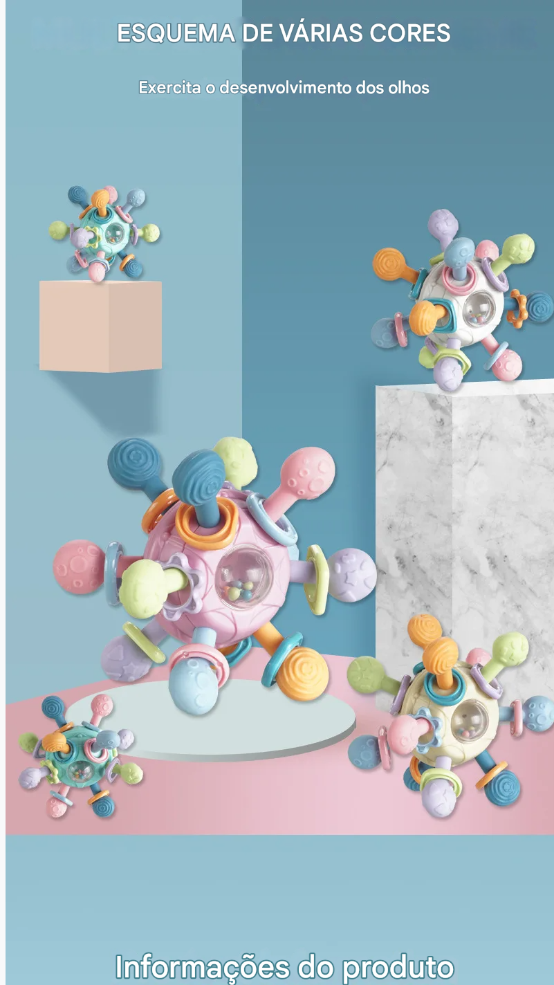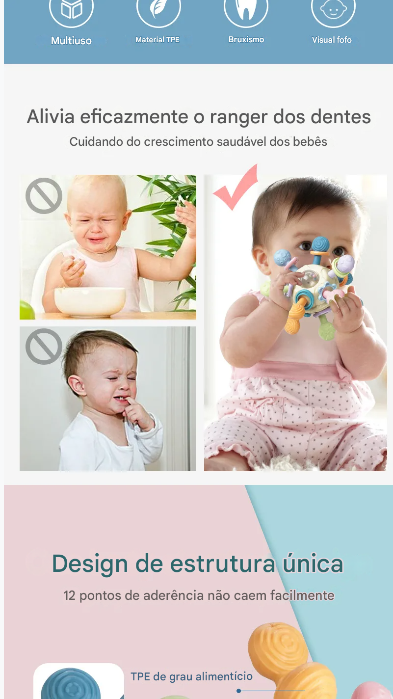 Funções: Mordedor, chocalho, bola giratória, brinquedo de agarrar