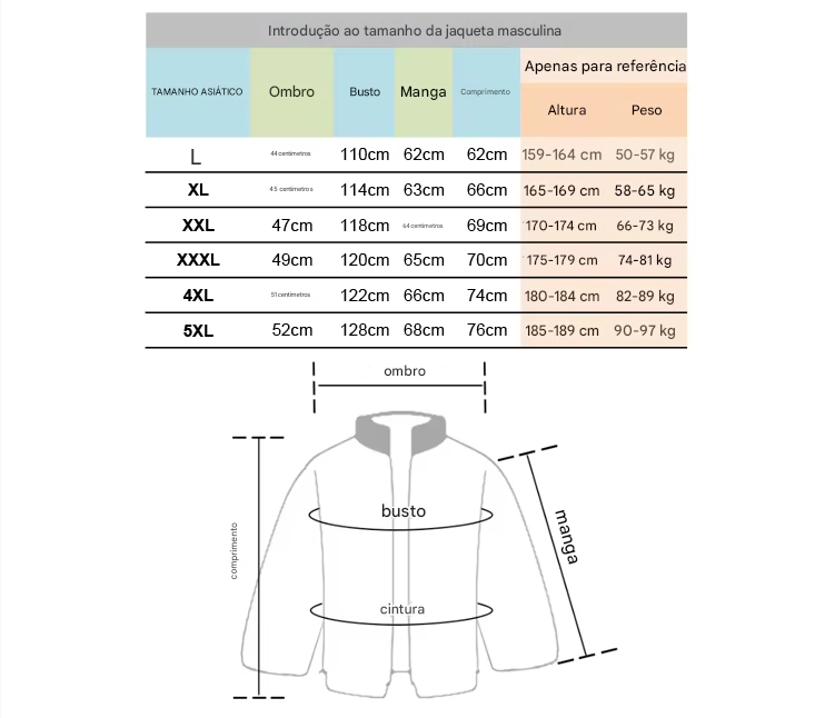 Tamanhos Asiáticos Disponíveis: L, XL, 2XL, 3XL, 4XL, 5XL