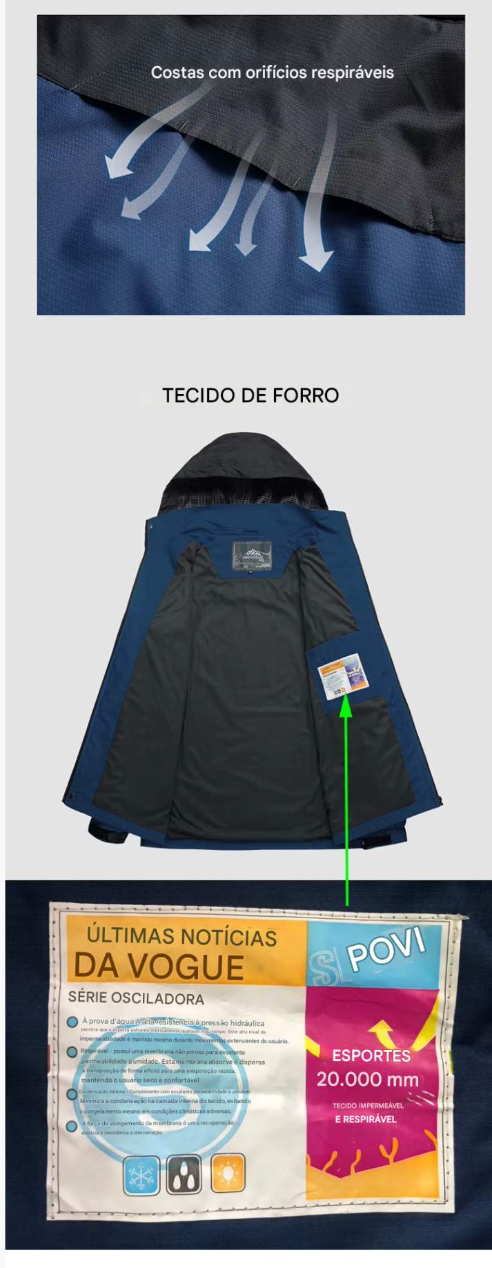 - Tecnologia de quebra-vento de alta densidade, filme impermeável intermediário, tecido de malha superfina na camada interna.